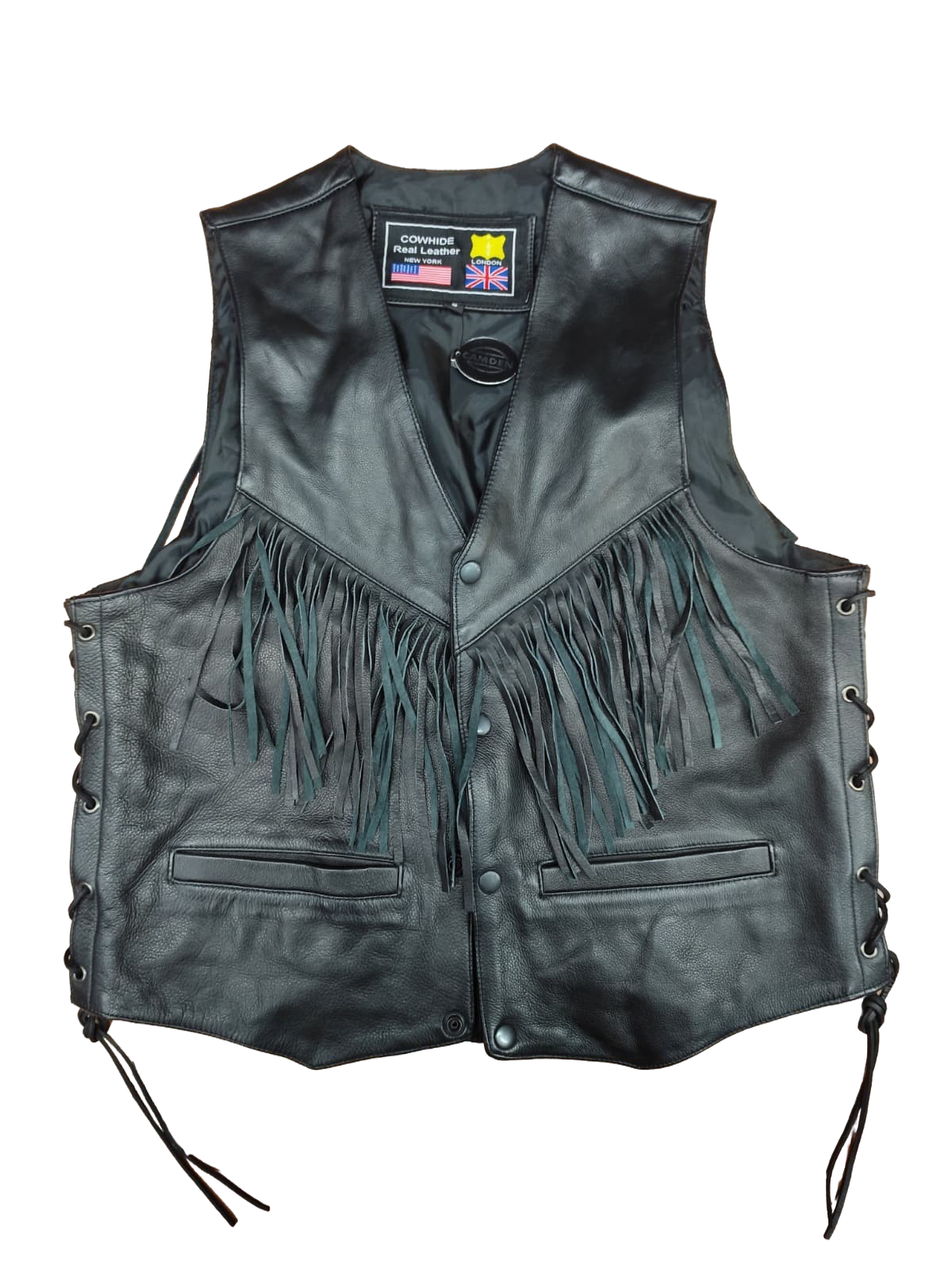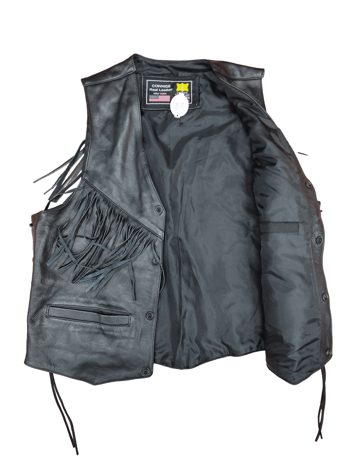 Chaleco cuero color negro con flecos de piel de vaca
