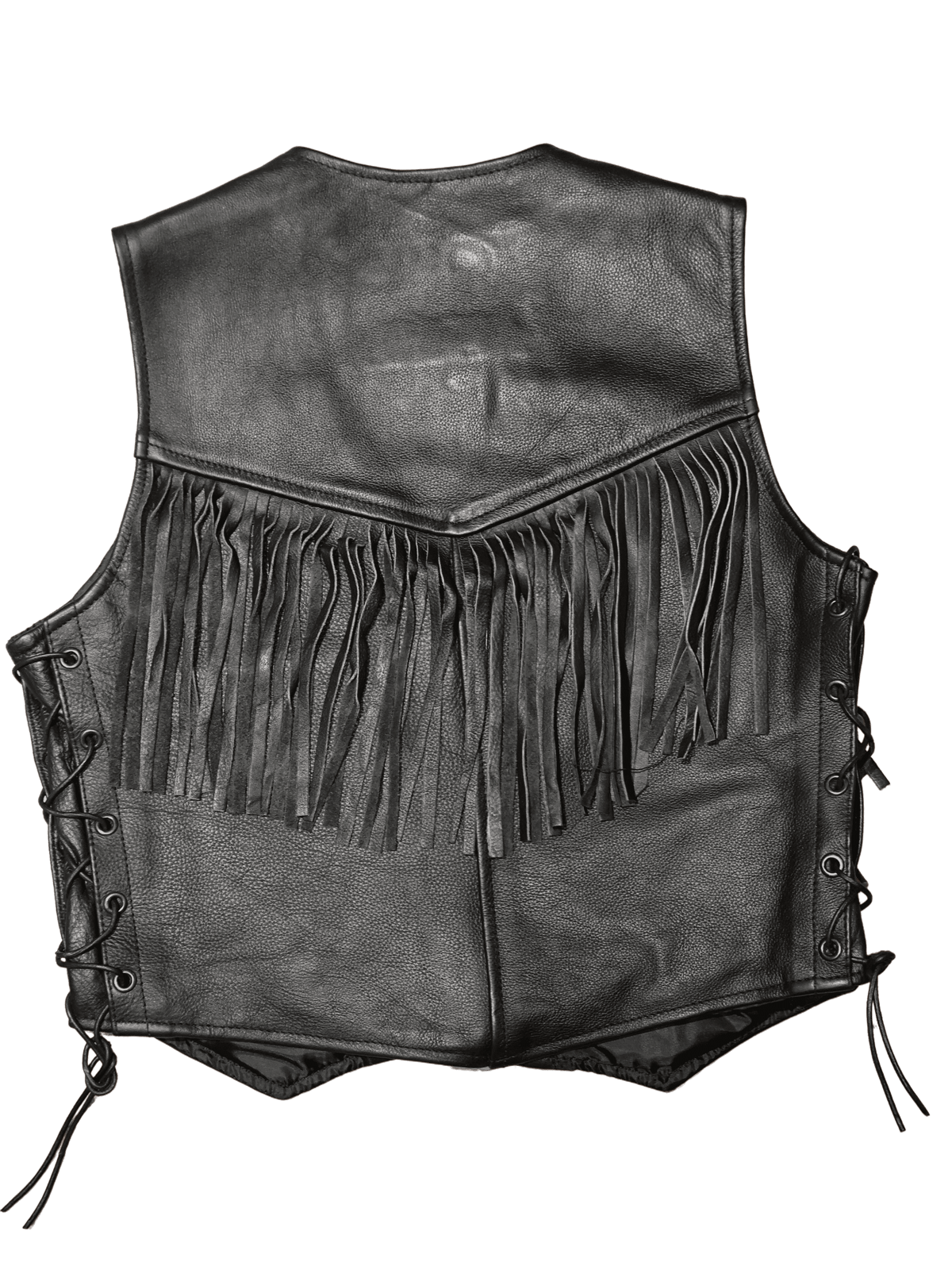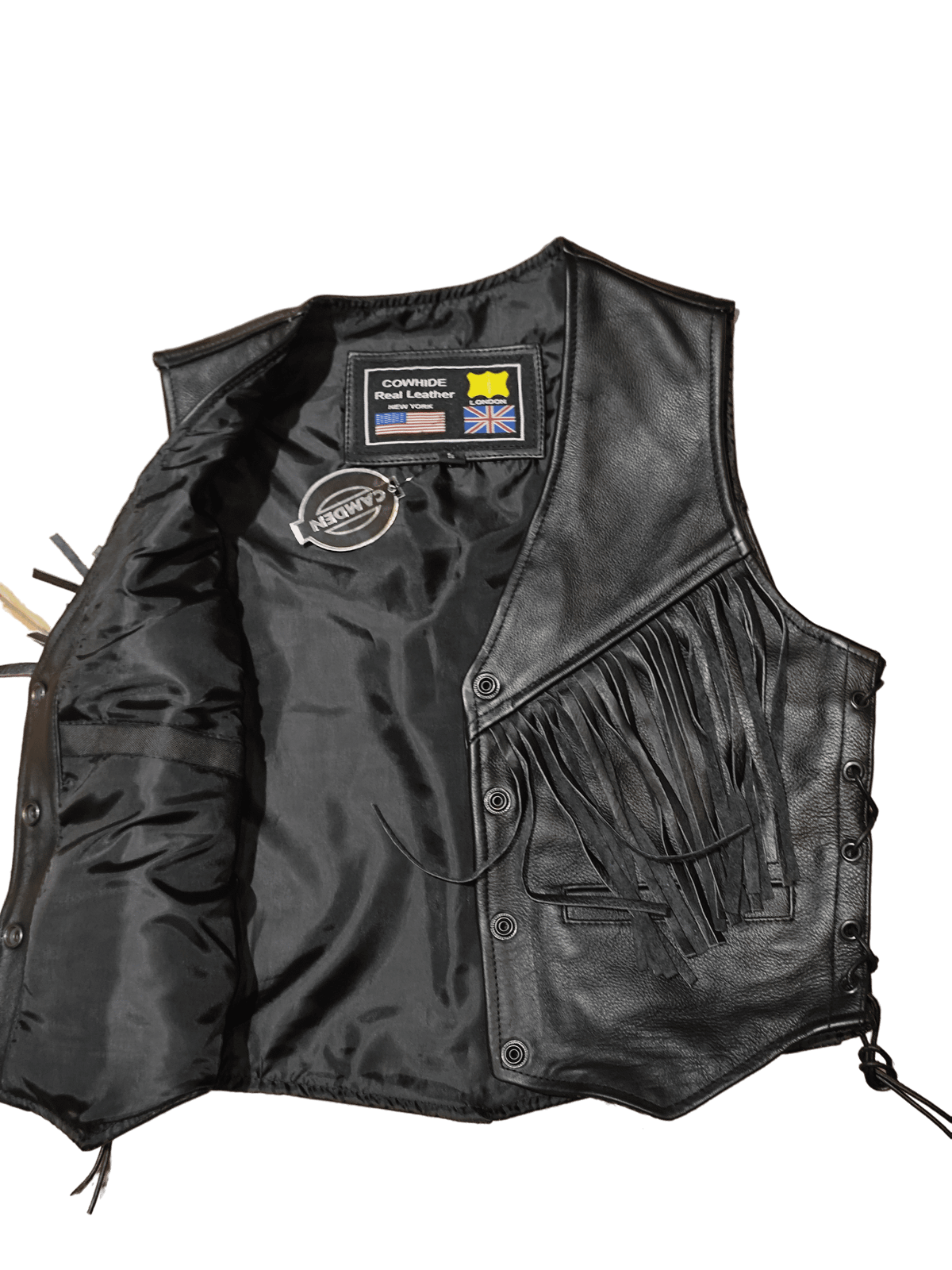 Chaleco cuero negro chica con flecos de piel de vaca con cordones laterales