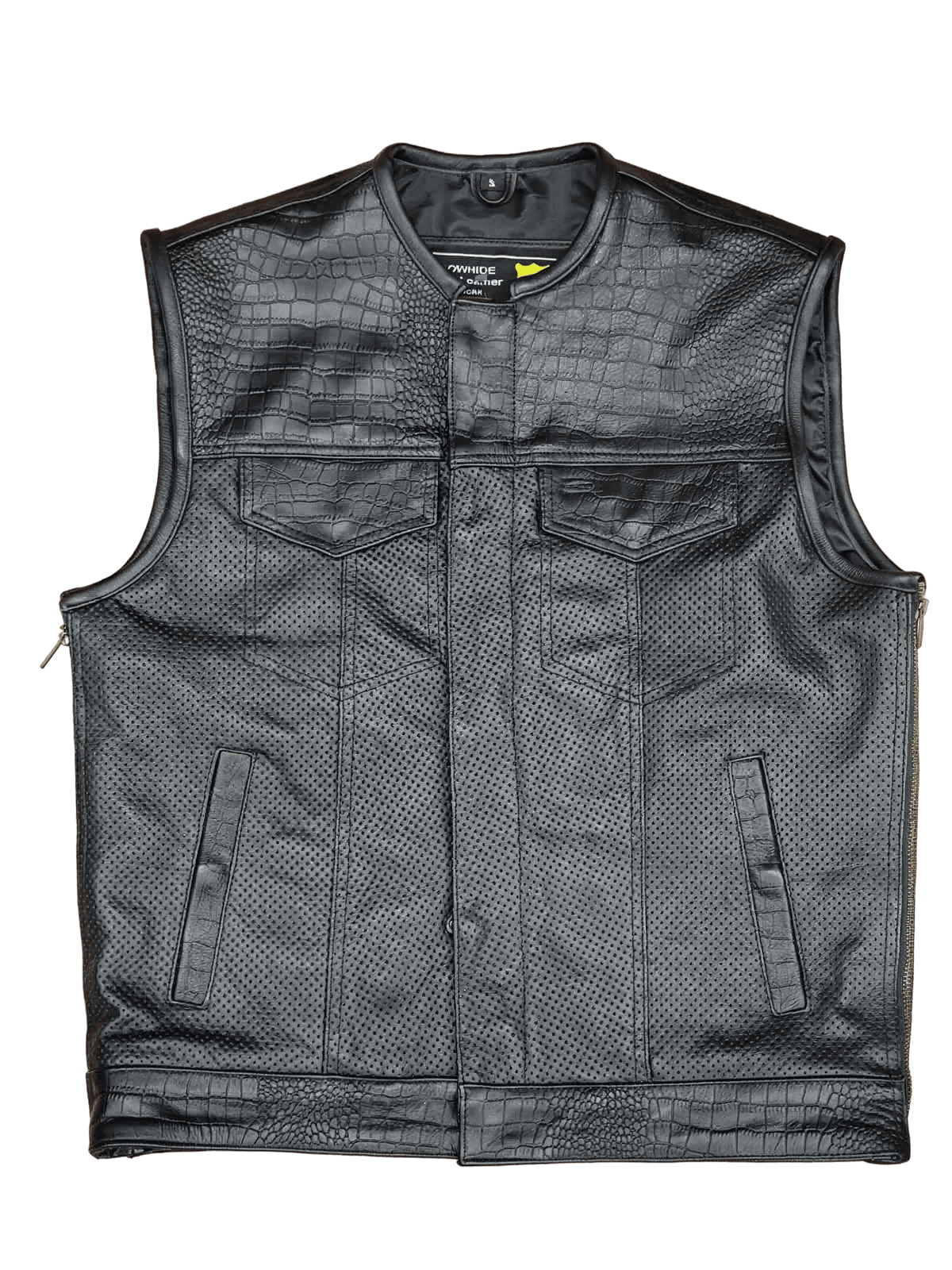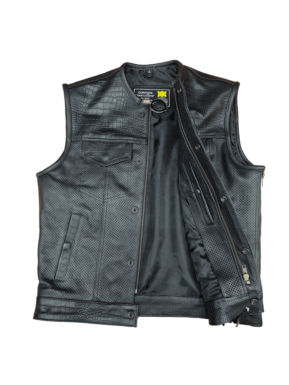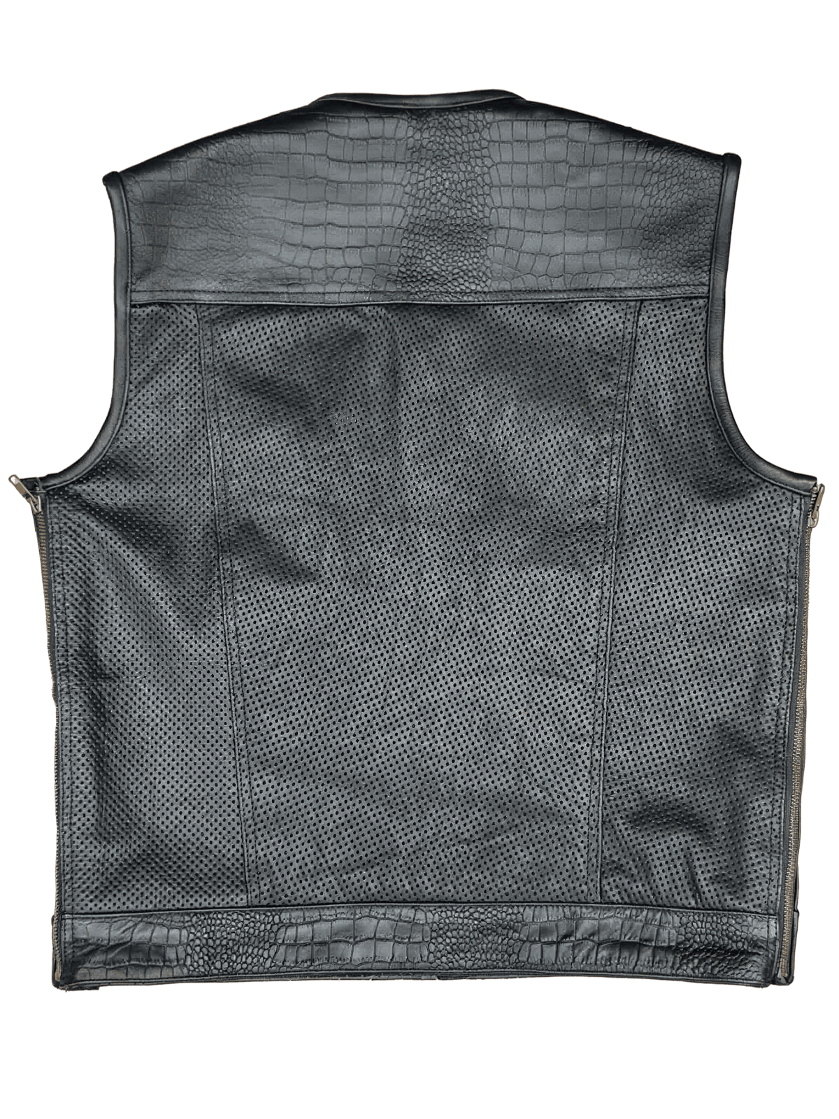 Confeccionado a mano con piel de vaca con un estampado de cocodrilo en la parte superior, la parte inferior del chaleco es de cuero perforado lo que facilita la ventilación.