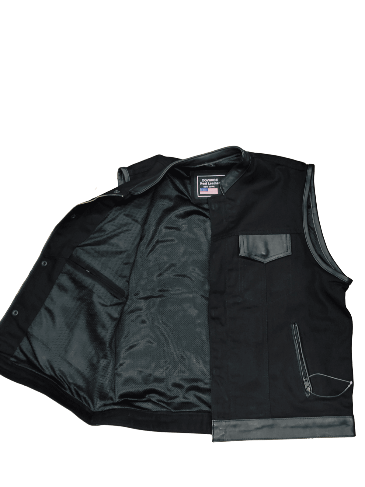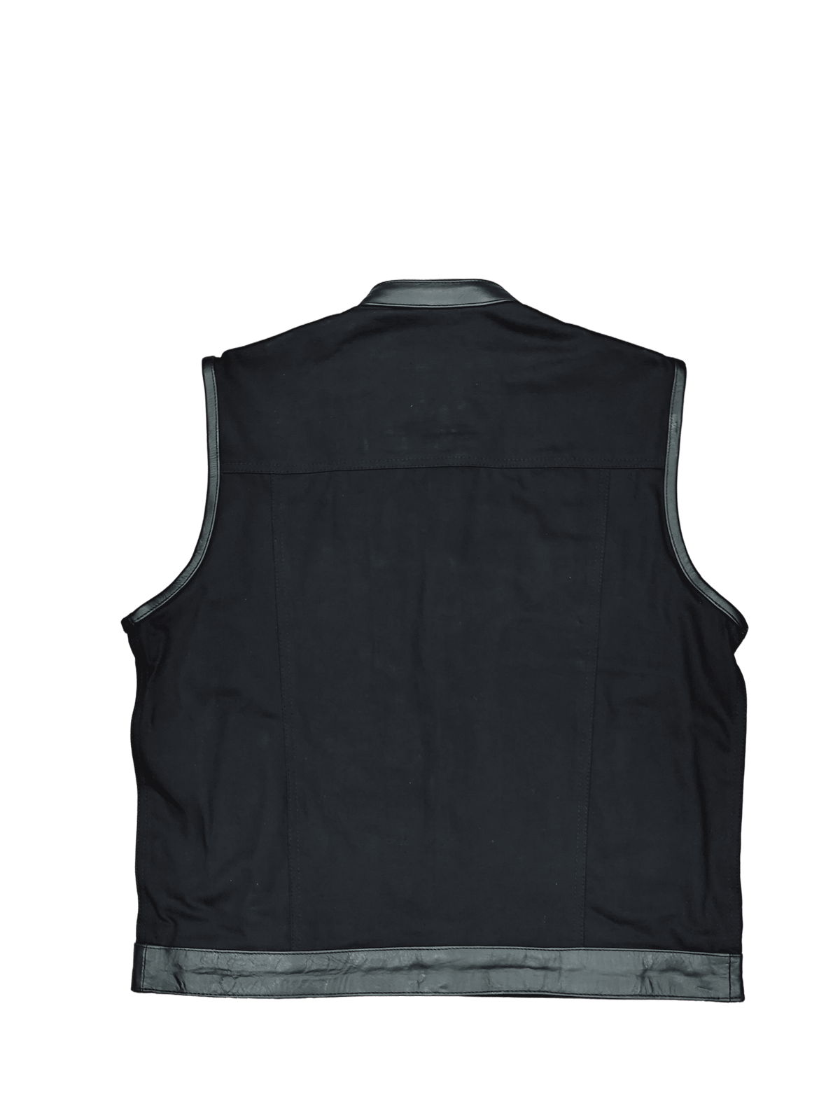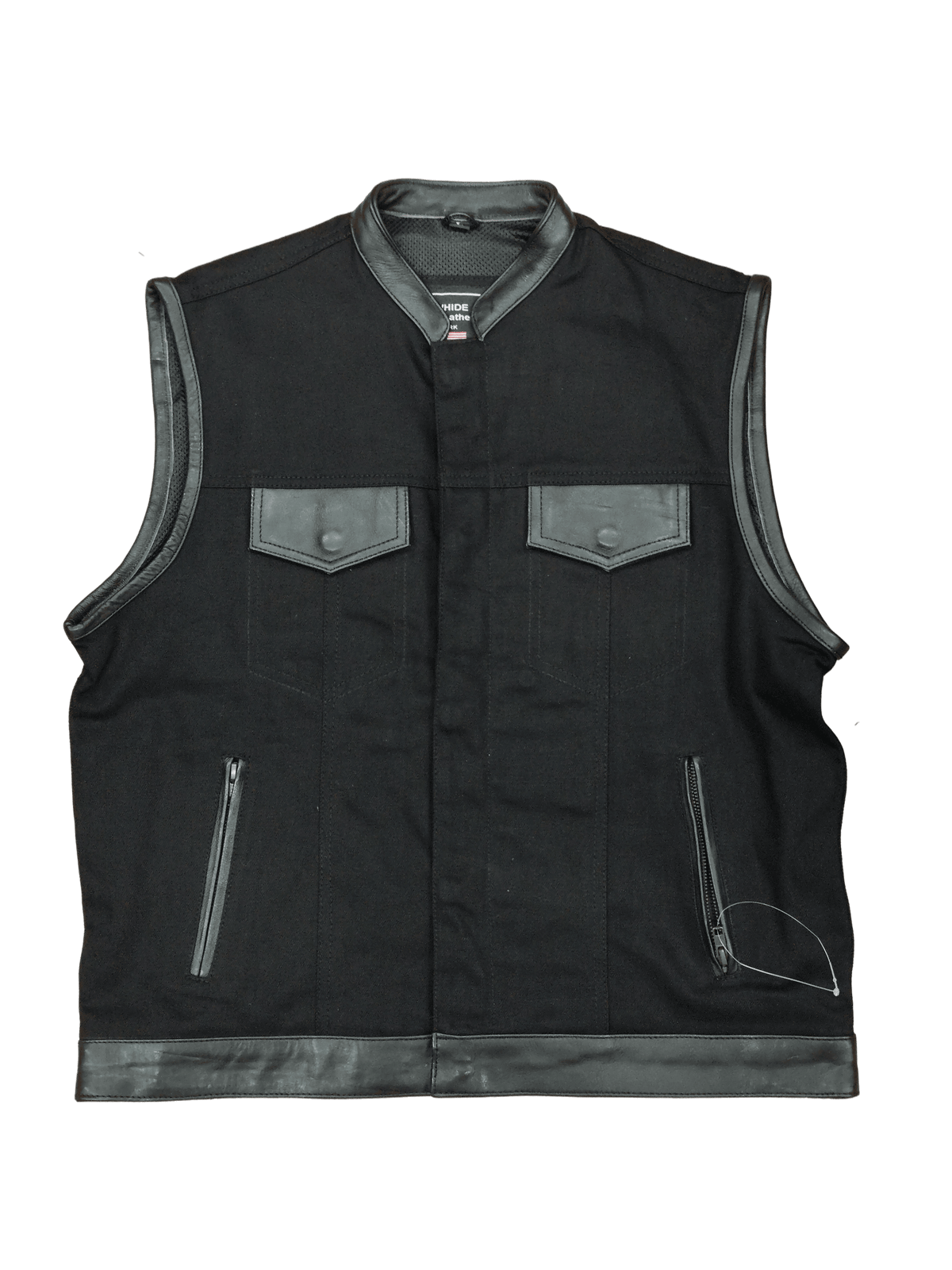 Chaleco tejano con bordes y detalles de cuero. Estilo motard con cremallera en bolsillo interior frontal y lateral