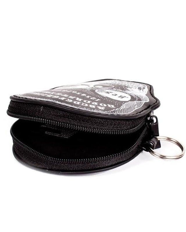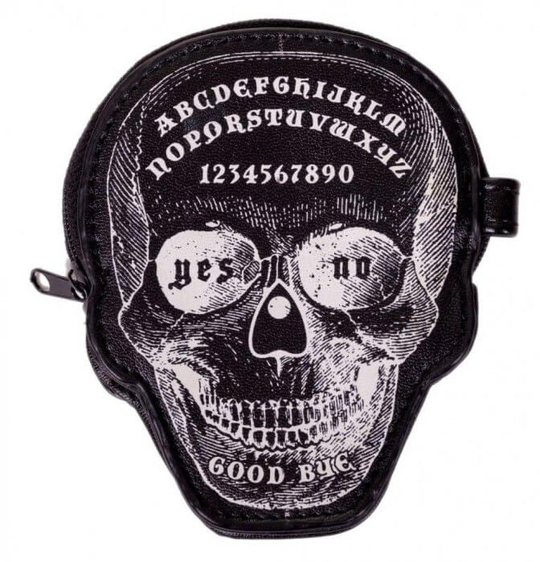 Schedelvormige portemonnee met ouija-print aan beide zijden. Ideaal voor het opbergen van munten, sleutels of kleine papieren.